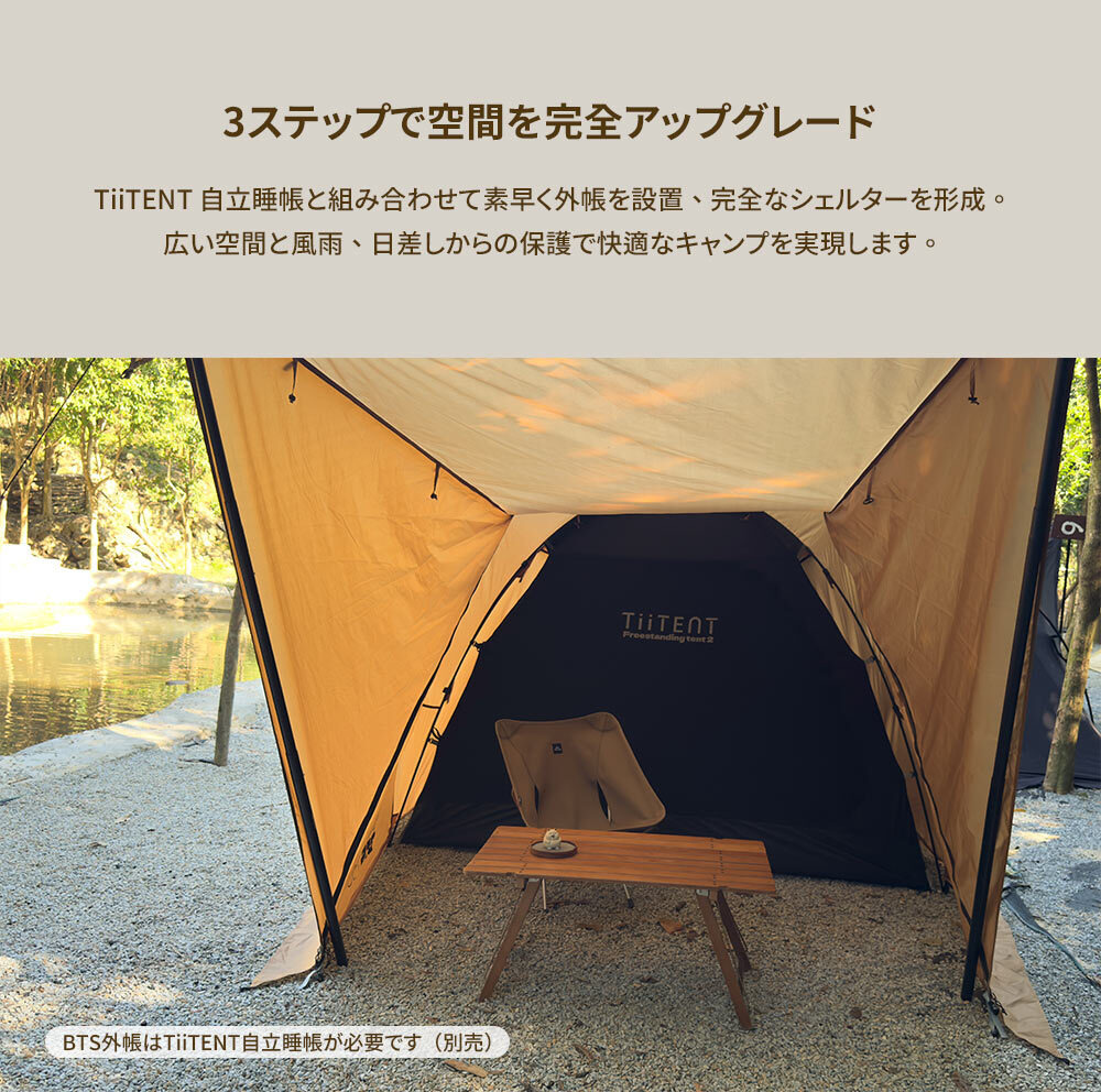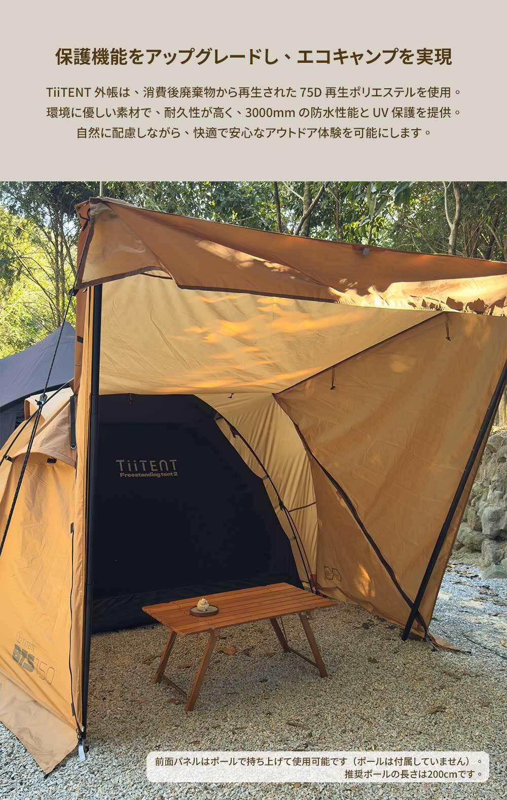 TiiTENTの自立式テント専用に設計されたこのフライシートは、革新的な75Dリサイクルポリエステルを使用しています。 これは、ペットボトルや古い布地などの消費後廃棄物から再生された素材で、地球資源への依存を減らしながら、耐久性と信頼性のあるアウトドア保護を提供します。